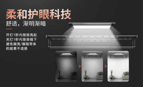 目前,很多智能晾衣机都搭配了LED灯,安装在阳台上,可以充当阳台灯使用。但是在实际使用的过程中,如果阳台灯开关时亮度变化过快,容易导致用户产生眩晕不适。好太太亚运星耀系列智能晾衣机GW-1296采用了柔和护眼科技,在开灯和关灯一秒内才会逐渐亮起和逐渐暗下,从而能够有效避免突然开关灯,导致用户眼睛不适的状况,更好呵护用户的眼睛。