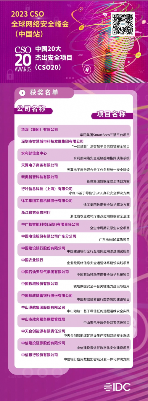 在2023全球CSO网络安全峰会(中国站)上,举行了“2023 IDC中国20大杰出安全项目(CSO20) ”和“2023 IDC中国 CSO名人堂 (十大人物) ” 颁奖仪式。