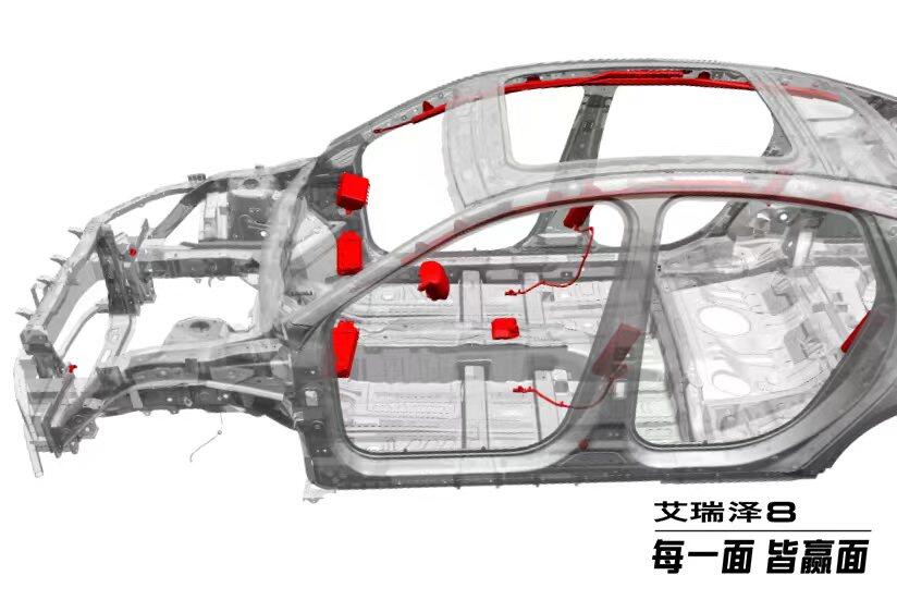 针对侧碰,研发人员对艾瑞泽8的侧面进行了A,B,C柱可变性壁障和刚性柱碰多重试验,并引入包括车辆翻滚在内的百余种碰撞和日常使用工况,给用户提供更安全的保障。