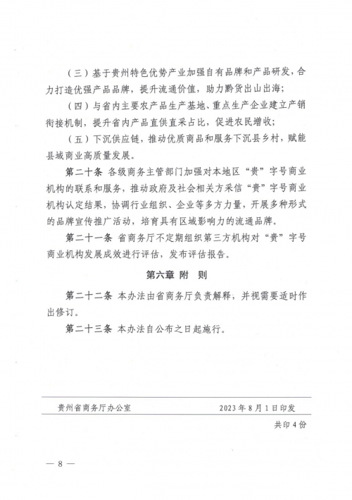 根据《“贵”字号商业机构示范创建管理办法》,贵州省商务厅将认定一批从事日用百货、农产品及食品等批发、零售、电商,在省内具有贵州特色优势、质量优良、管理先进、市场引领、社会认可的企业,授予“贵”字标识使用权。