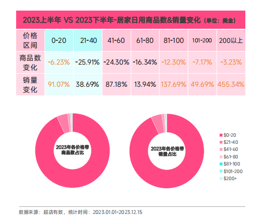 ●商品数减幅较小的$0-20、$81-$200以上是下半年销量涨幅表现最亮眼的价格线,可见居家日用类仍然是一个值得关注的领域。